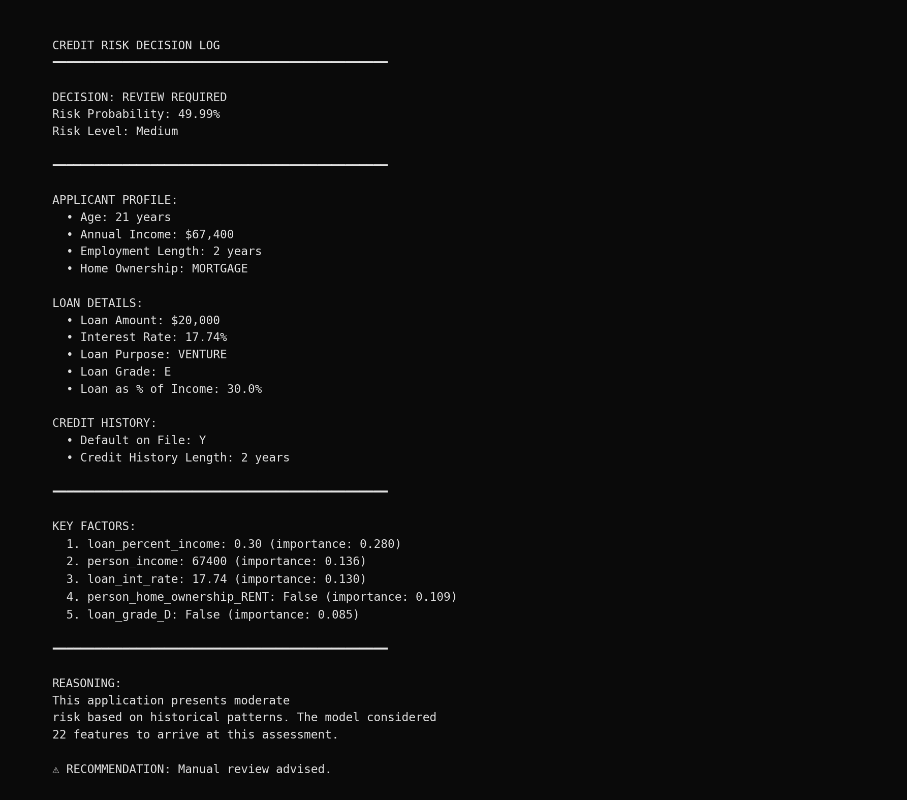 This project was built to explore that boundary: not just a model, but an agent-like decisioning loop with a structured explanation layer and an adaptive policy mechanism.