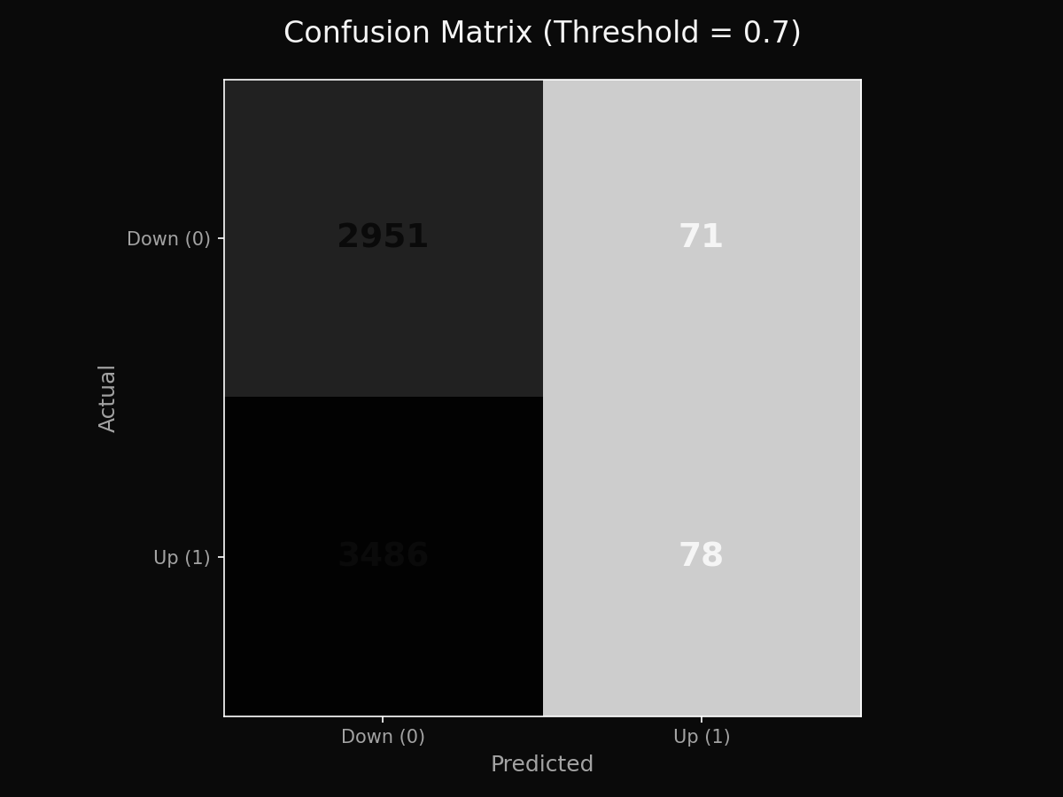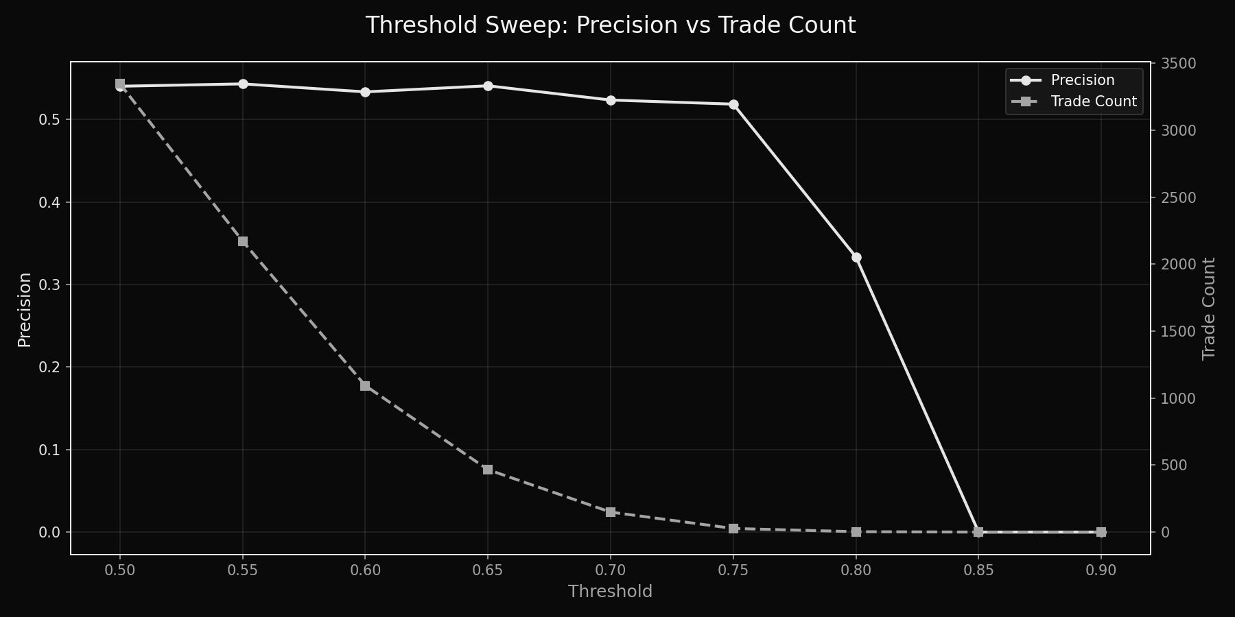 With a higher threshold (e.g., 0.7), the model produces fewer "trade signals," which can inflate precision while lowering recall. That trade-off is not a bug—it's a design choice.